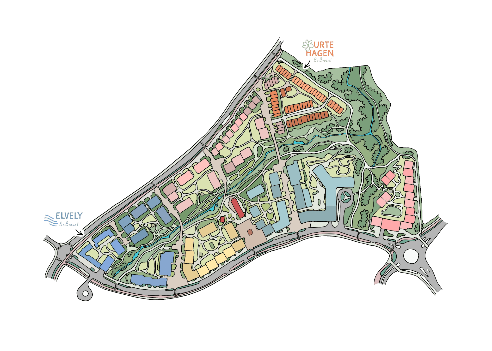 ALL BILTRAFIKK OG Parkering blir under bakkeplan. Flotte sykkelveier snirkler seg igjennom Brøset. Dette gir trygghet, stillhet og frihet til bevegelse.