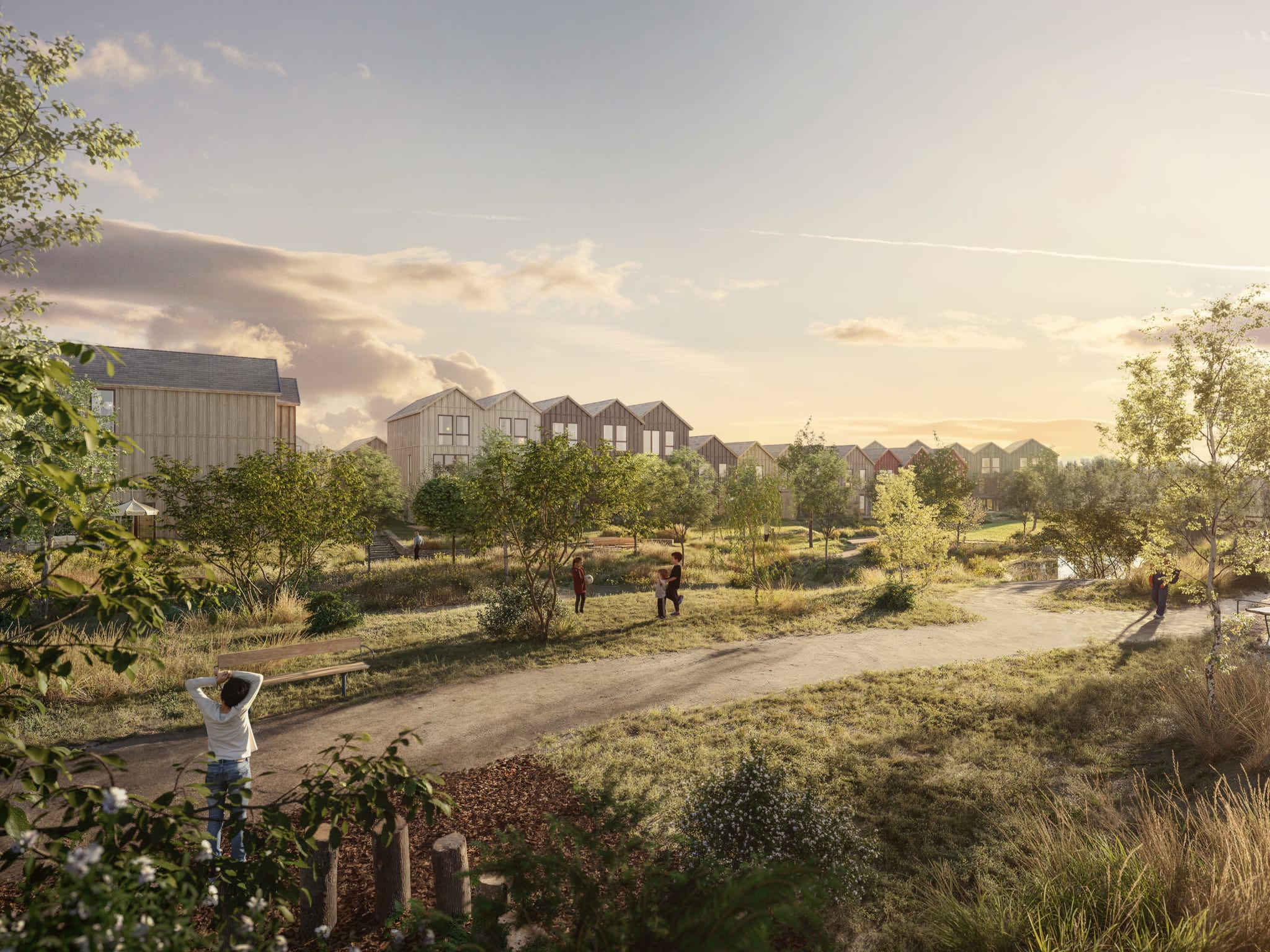 Mer enn halvparten av den nye bydelen er avsatt til grønne og åpne arealer med gangstier, parkbenker, lekeplasser og sandvolleyballbane.