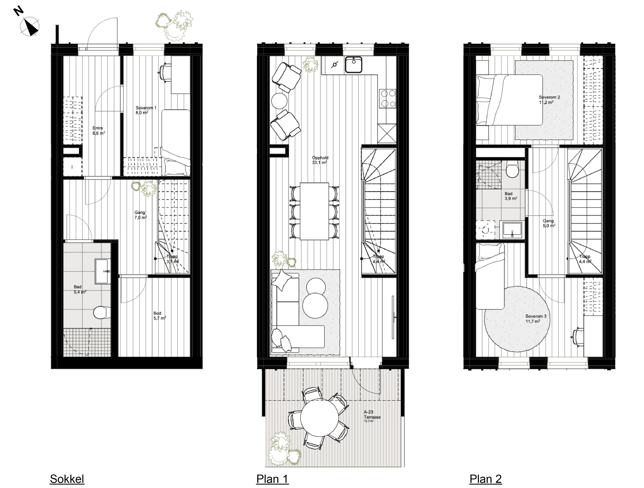 Stilfullt rekkehus over tre plan med funksjonell og familievennlig planløsning. Her får du tre romslige soverom med god plass til garderobeløsninger, to moderne og innbydende bad, samt en lys og luftig stue med åpen kjøkkenløsning – perfekt for sosialt samvær. Fra stuen har du direkte utgang til en solrik terrasse som inviterer til avslapning og hyggelige måltider ute. Boligen har også en romslig entré med direkte tilgang til en innvendig bod – ideell for praktisk oppbevaring.