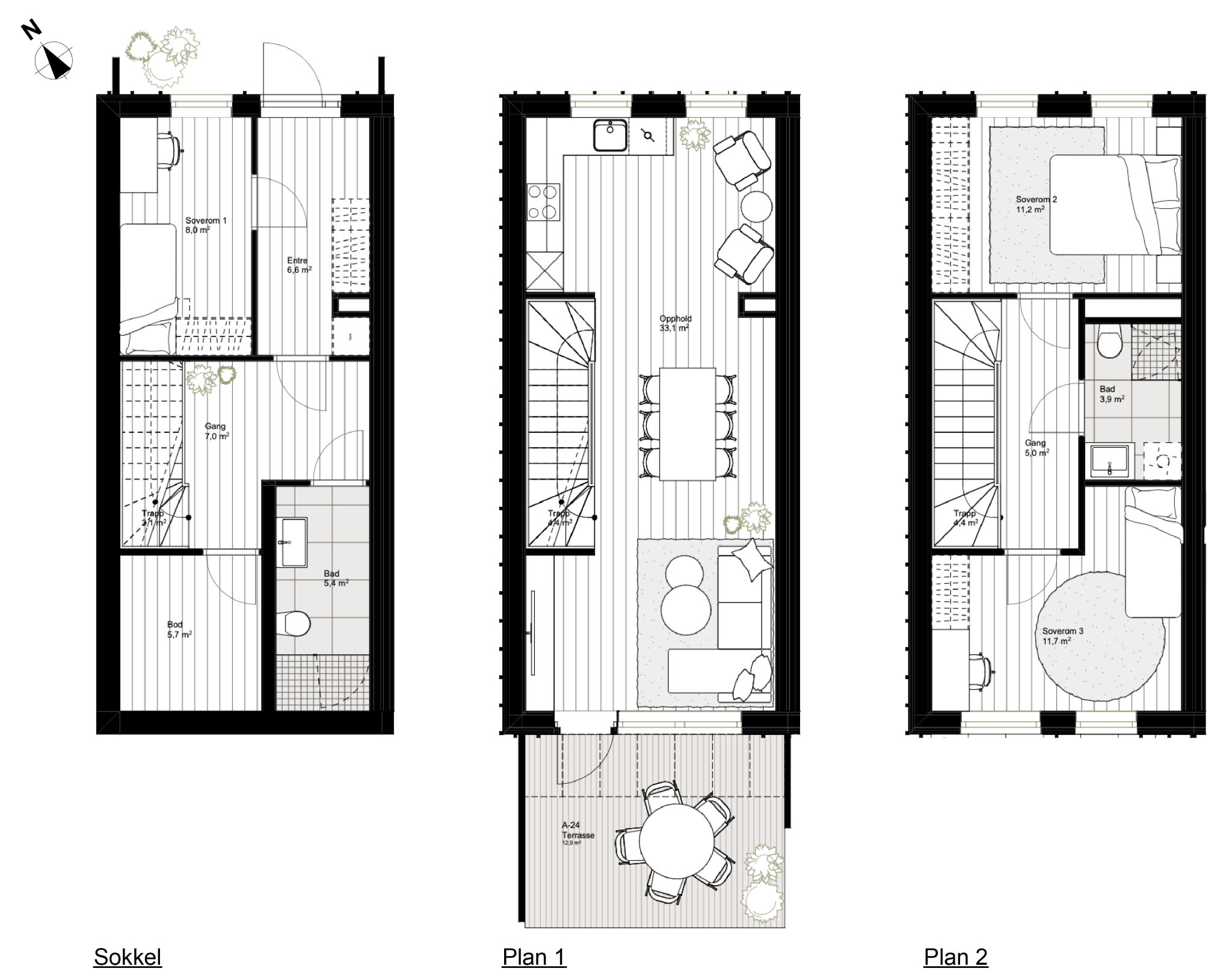 Attraktivt enderekkehus over tre plan med gjennomført og praktisk planløsning. Boligen har tre romslige soverom med gode muligheter for garderobeløsninger, to elegante bad og en åpen stue- og kjøkkenløsning som skaper en sosial og innbydende atmosfære. Fra stuen har du direkte tilgang til en solfylt terrasse – perfekt for avslapping og hyggelige sammenkomster. I tillegg får du en romslig entré med direkte adkomst til en innvendig bod, som gir deg rikelig med oppbevaringsplass