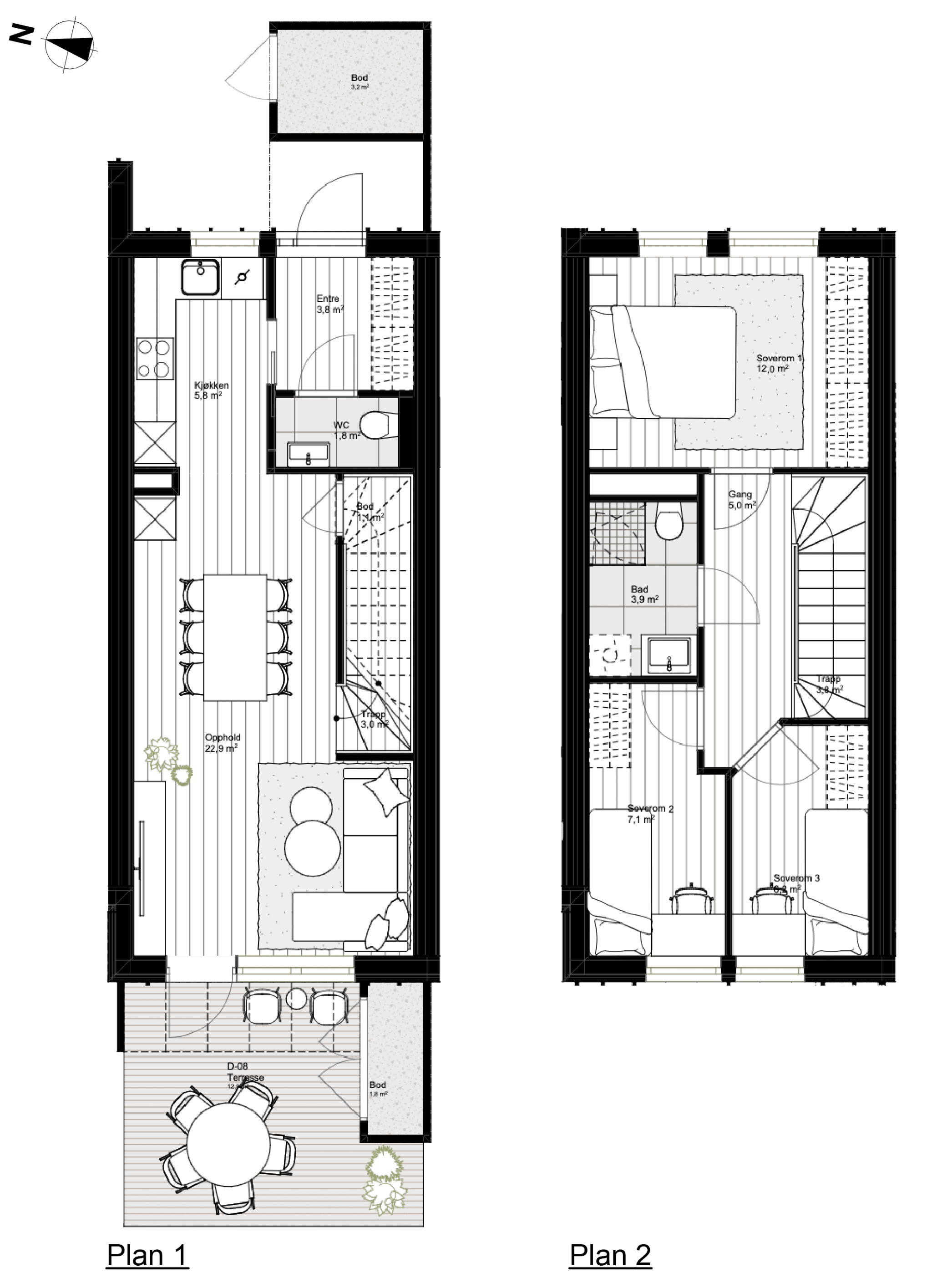 Moderne rekkehus over to plan med praktisk planløsning. Rekkehuset kan by på tre soverom, delikat bad og separat WC-rom, samt en åpen stue- kjøkkenløsning. Fra stuen er det utgang til en herlig terrasse med gode solforhold. Boligen har to boder som gir godt med lagringsplass.