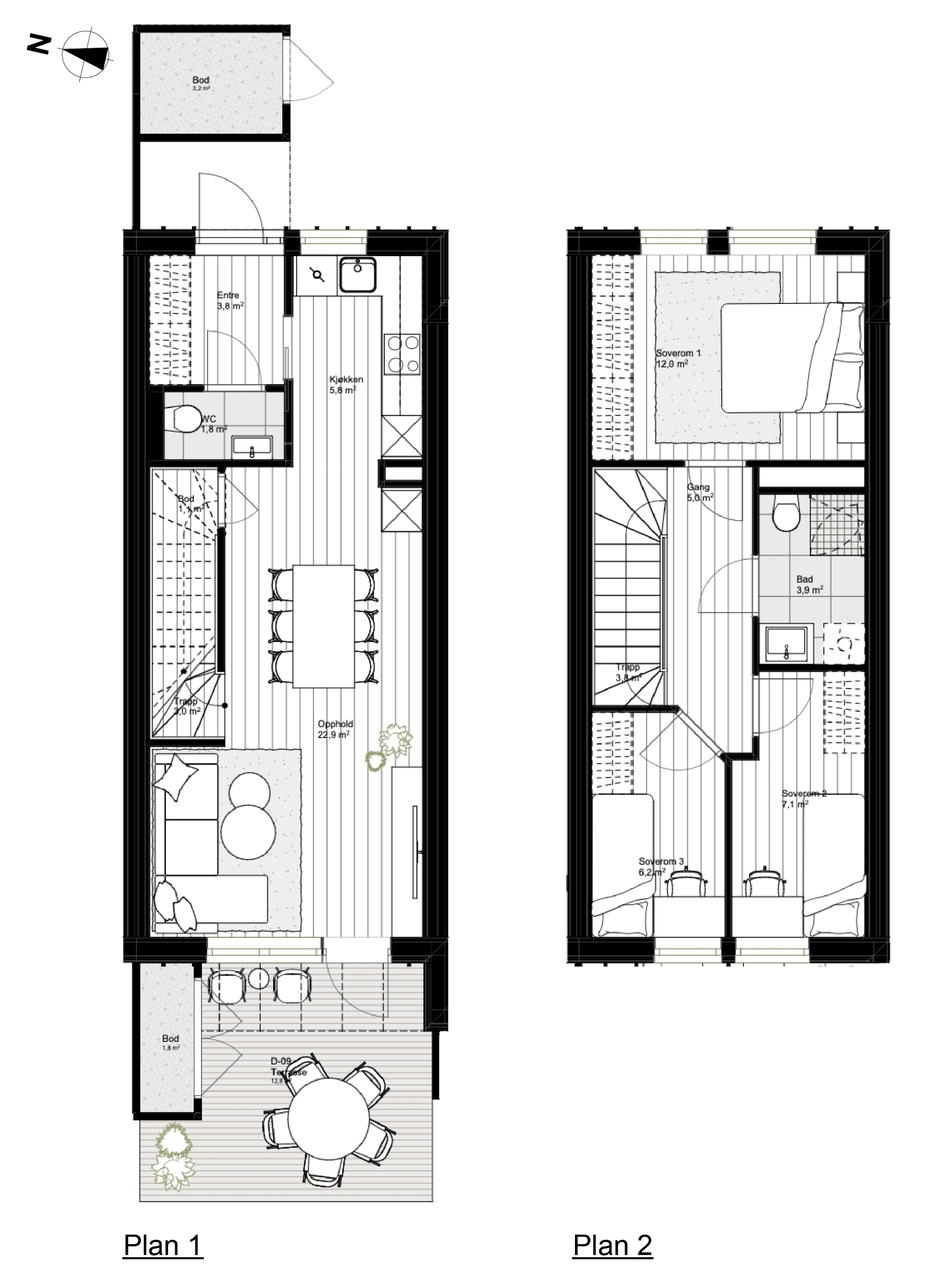 Nytt og flott rekkehus over to plan med familievennlig beliggenhet. Fra stuen og kjøkken er det utgang til en flott og solrik terrasse med tilknytning til en av boligens to boder. Fra gangen har man tilgang til separat WC-rom, i tillegg til bad i andre etasje hvor det også er tre soverom av god størrelse.