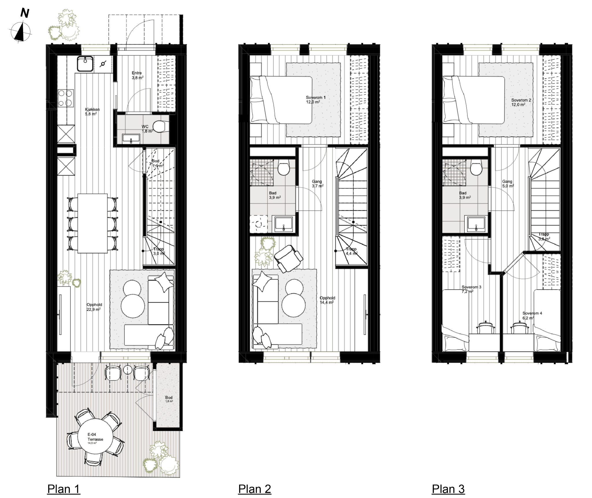 Moderne rekkehus over tre plan med nyboligstandard og flott beliggenhet. Boligen kan blant annet by på fire soverom av god størrelse, to bad i tillegg til et separat WC-rom, egen TV-stue i 2. etasje og en åpen stue- kjøkkenløsning i 1. etasje med utgang til en herlig terrasse med direkte tilknytning til en praktisk bod.